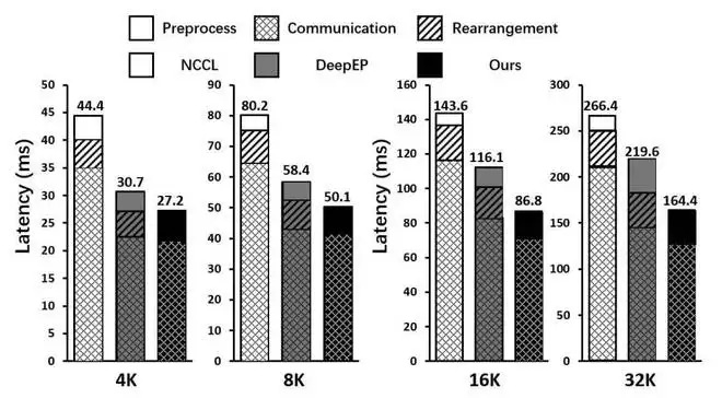 尽管前面通过描述信息已经可以精确表达 “哪些 token 从哪里来、到哪里去”,但一个更现实的问题随之而来:在引入细粒度重排语义之后,通信还能否保持原有的吞吐效率?