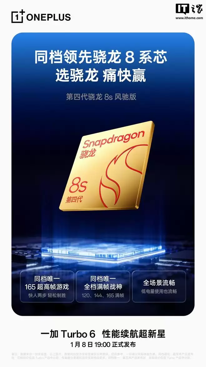 IT之家 1 月 4 日消息,一加 Turbo 6 系列新机定档 1 月 8 日晚 7 点发布,外观已经公开,可选追光银、旷野绿、独行黑三款配色。一加最新今日预热,一加 Turbo 6 搭载第四代骁