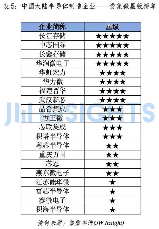 最后,爱集微知识产权咨询针对中国大陆半导体制造企业,在综合考虑专利数量、发明专利占比、授权专利与有效专利占比、专利海外布局、被引用比例、专利诉讼、专利转让、专利许可、专利质押、专利撰写水准等指标,进行专利实力星级评价,结果如下。