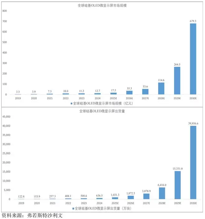 根据弗若斯特沙利文数据显示,全球硅基OLED显示屏销售额从2020年的3.9亿元飙升至2024年的12.7亿元,年均复合增长率达34.3%;预计到2030年,这一数字将暴涨至679.3亿元,年复合增长率高达94.11%。