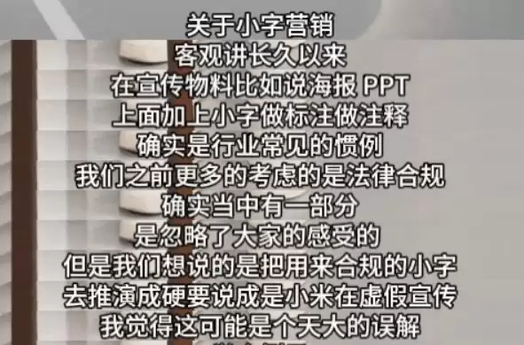 针对备受关注的“小字营销”现象,雷军坦言,使用不易看清的小字确实是行业内的一个惯常做法。对于这一点,小米将从现在开始,立即着手改进。