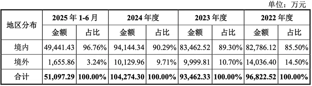 报告期内,公司主营业务中境外销售收入占比分别为14.50%、10.70%、9.71%、3.24%。
