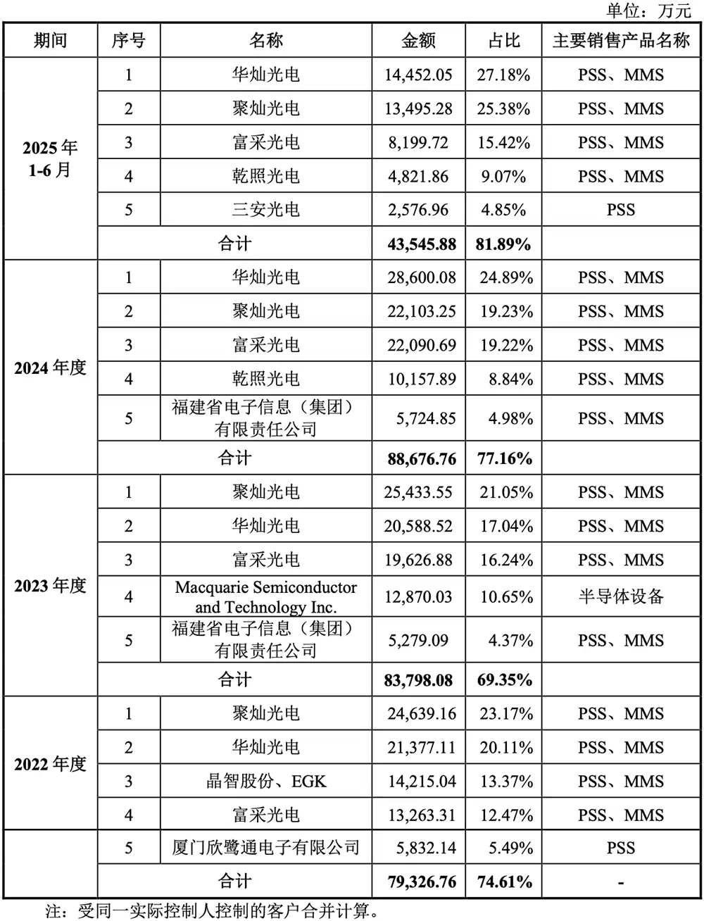 目前,公司的直接客户已覆盖富采光电、首尔伟傲世、三安光电、华灿光电、聚灿光电、乾照光电等海内外头部LED芯片企业。其终端客户涵盖苹果、三星、LG、海信、TCL、比亚迪、赛力斯、蔚来、理想等消费电子及新能源汽车领域的知名企业。