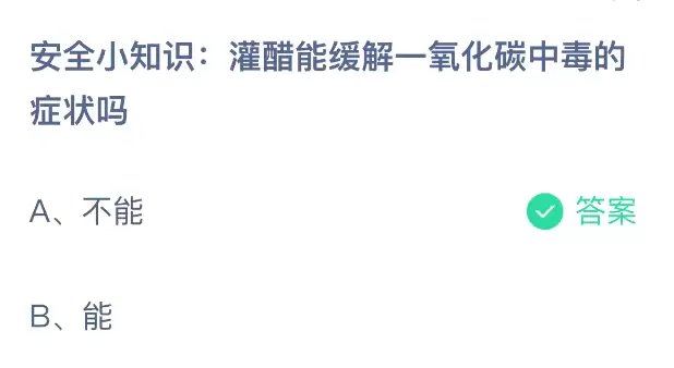 安全小知识:用醋灌进去真的能缓解一氧化碳中毒的症状吗?支付宝小鸡课堂今天开课啦!每天花个一分钟答题就能赚饲料,喂喂小鸡还能顺便贡献一份爱心,轻松又有意义!2026年1月4日蚂蚁庄园的小鸡课堂题目正确答案是【不能】,用醋缓解一氧化碳中毒缺乏科学依据,甚至可能刺激呼吸道,反而加重病情。