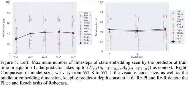 模型规模:这是一个令人意外的发现:在简单的模拟环境(如 Maze, Wall)中,增大模型规模(从 ViT-S 到 ViT-L)非但没有帮助,反而可能由于嵌入空间过于复杂而导致规划效率下降。但对于复杂的现实数据(DROID),大容量的编码器和更深的预测器则展现出了明确的正相关收益,说明任务的物理复杂度决定了智能体所需的智力上限。