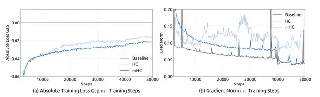 在训练一个拥有270亿参数的模型时,使用原始超连接的方案在约1.2万步时出现了异常的损失值尖峰(相当于学习成绩突然暴跌)。而采用mHC的模型训练曲线平滑下降,最终效果比基线模型更好。