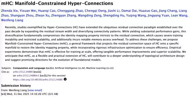 2025年12月31日,来自DeepSeek-AI的研究团队在arXiv上发布了一篇题为《mHC: Manifold-Constrained Hyper-Connections》的技术论文。这项研究由解振达、韦毅轩、曹焕琦等十余位研究人员共同完成,通讯作者为解振达,DeepSeek创始人梁文锋亦参与其中。他们提出了一种全新的神经网络连接方式,有望解决当前大模型训练中一个长期被忽视却至关重要的问题:如何在提升性能的同时,保持训练过程的稳定与高效?