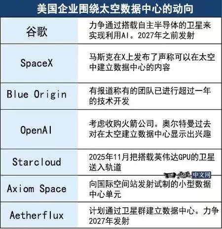 美国科技企业正致力于推进在太空中建立用于AI的数据中心的构想。谷歌计划在2027年之前发射搭载其人工智能技术的人造卫星,SpaceX和OpenAI也对此表现出浓厚兴趣。英伟达正在为那些准备发射搭载AI芯片的人造卫星的公司提供支持。未来,太空数据中心或许将逐步取代正在激增的地面AI基础设施。