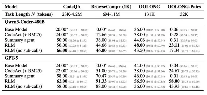 实验结果显示,裸跑 GPT-5 的表现随着输入长度和任务复杂度的增加而急剧下滑。在 OOLONG-Pairs 上,GPT-5 和 Qwen3-Coder 的 F1 分数都不到 0.1%。但套上 RLM 框架之后,GPT-5 的 F1 分数跃升至 58%,Qwen3-Coder 也达到了约 23%。