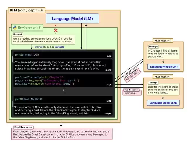 然后模型不再直接阅读全文,而是编写代码来“窥探”这个变量,打印一小段看看、用正则表达式搜索关键词、按章节拆分等等。更关键的是,模型还可以在代码里调用另一个语言模型来处理子任务,并把结果存回变量中。整个过程是迭代式的:模型执行一段代码,观察输出,决定下一步怎么做,直到最终拼凑出答案。