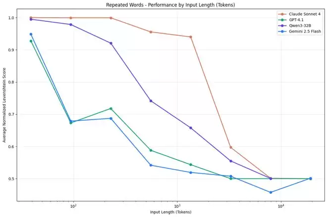 更值得注意的是,当任务本身变得复杂,比如需要语义推理而非简单的字面匹配,性能下滑会来得更早、更陡峭。所谓百万 token 的上下文窗口,实际有效利用的可能只有一小部分。