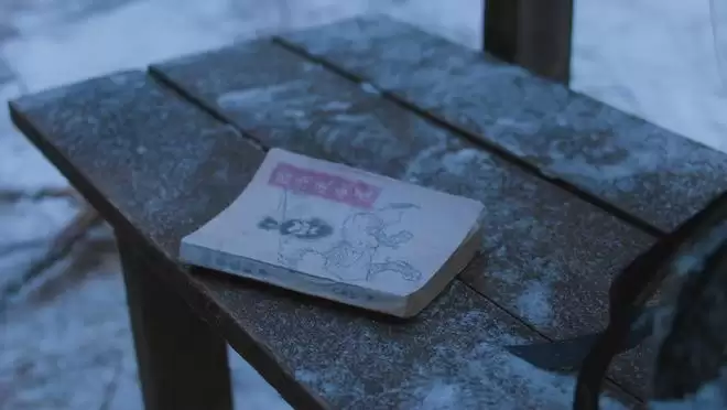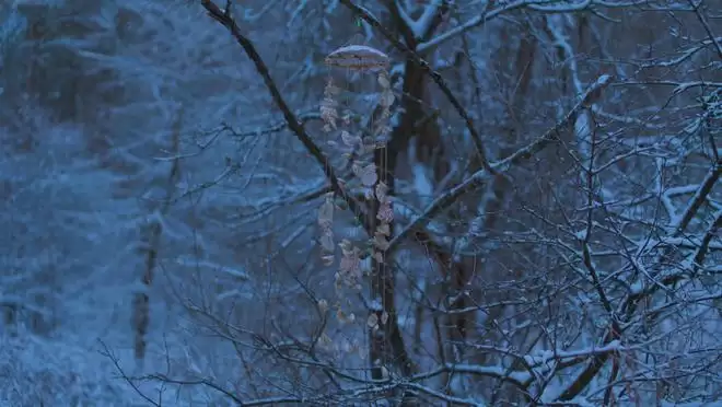 二舅走后,根据他的遗愿,他的骨灰被撒在了妻子李小珍撒的那棵树下。又是一个冬天,皑皑白雪覆盖了整片森林,树梢上的贝壳风铃吹动,老舅的朋友来到了这里。
