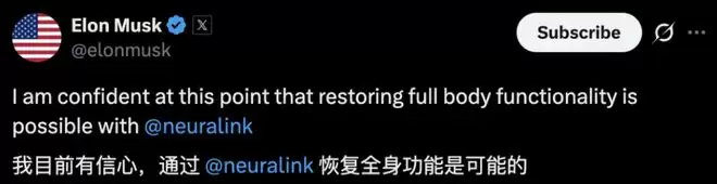 刚刚,马斯克在X平台上发文称,用Neuralink技术帮助瘫痪者恢复全身功能在理论上是可能的。