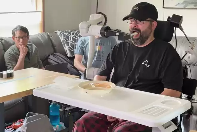 一位ALS(肌萎缩侧索硬化症)患者使用脑机接口思维控制JACO机械臂进行喂食