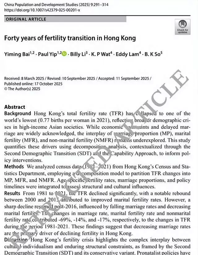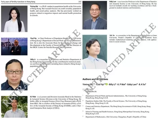 涉事论文名为《香港40年生育率转变(Forty years of fertility transition in Hong Kong)》,第一作者是香港大学社会行政与工作系博士生白逸铭,通讯作者则是其导师叶兆辉。其他作者包括来自香港大学、暨南大学和香港政府统计处的教授、讲师与研究员。