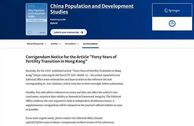 几天后,期刊《当代中国人口与发展》也发表了更正声明,称作者向编辑部报告称,这篇论文的引用列表和对应文内引用中,由于提交前的疏忽,存在“不匹配与不准确之处”。该期刊编辑部确认,论文的核心观点链与引用问题无关。