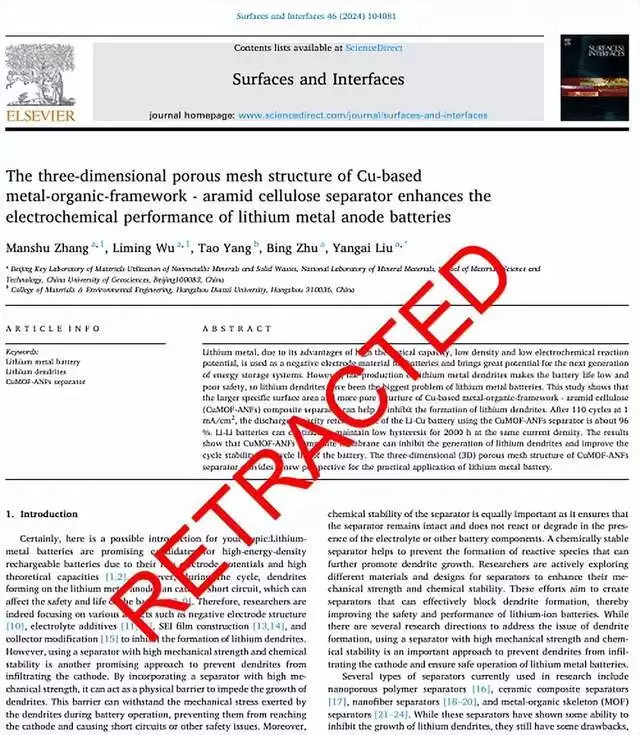 比如,2024年3月,发表于SCI期刊《表面与界面(Surfaces and Interfaces)》的一项关于锂电池的研究,就出现了明显的AI生成内容。该论文第一页的引文部分第一句话写道:“没问题,以下是一个可供参考的主题引言(Certainly,here is a possible introduction for your topic)。”