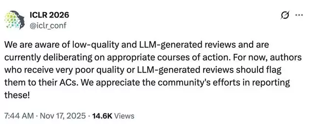 这一事件已经得到ICLR最新的回应。ICLR称,已经注意到低质量的评审以及由大模型生成的评审意见,目前正在讨论应采取的适当措施。目前,ICLR会将意见质量过差或由AI生成的作者,标注并反馈给所在领域主席。