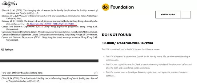 类似的问题还有很多。香港媒体《明报》的统计显示,这篇论文一共引述了61项文献,其中21项附带了DOI识别码,另有35项附有谷歌学术链接,但是点击后,分别有7项显示DOI不存在,22项显示无法找到此文章。