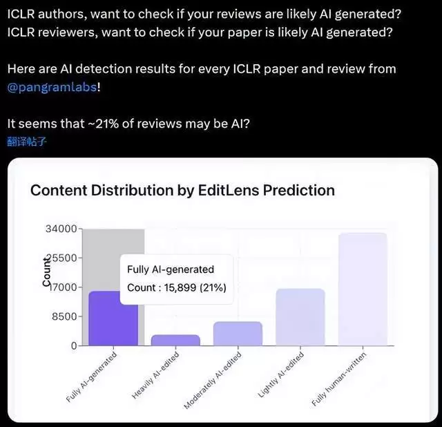 2025年,AI圈顶会NeuralPS、ICLR等也因审稿人使用AI辅助而饱受争议。研究机构Program Labs对ICLR 2026的7.58万篇论文的审稿意见进行了统计和分析,结果显示,其中有21%完全由AI生成,36%由AI进行大幅编辑,仅有43%的审稿意见完全由人类撰写。