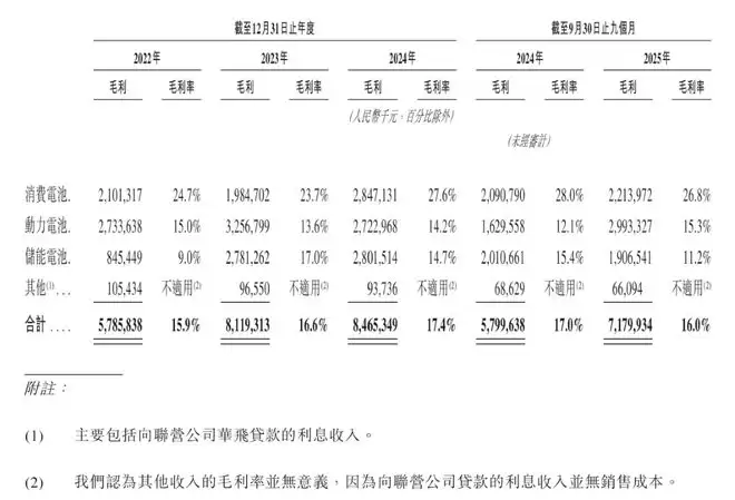 在2024年、2024年和2024年,亿纬锂能毛利率为15.9%、16.6%和17.4%,2025年前9个月为16.0%,较2024年同期的17.0%下滑了1个百分点。