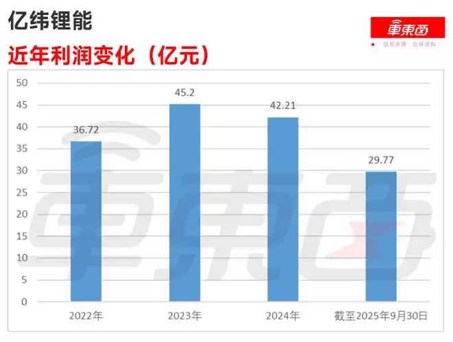 利润方面,在2024年、2024年和2024年,亿纬锂能的净利润分别为人民币36.72亿元、45.20亿元、42.21亿元,截至2025年9月30日为人民币29.77亿元,较2024年同期的32.74亿元同比下滑约9.07%,对此亿纬锂能解释为主要由于以股份为基础的薪酬费用及员工薪酬和福利费用增加导致管理费用增加人民币13.37亿元。