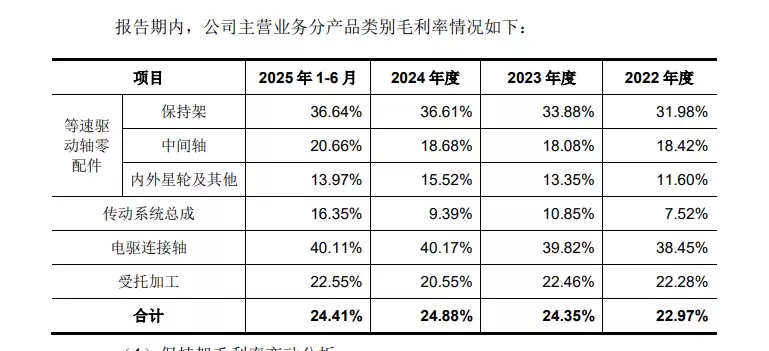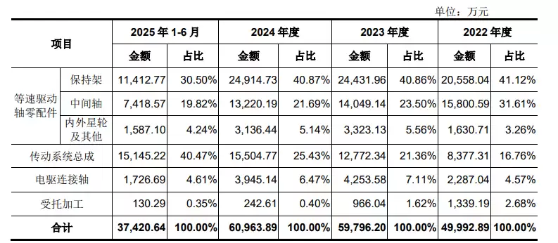腾励传动专注于汽车传动系统关键零部件及系统总成的研发、生产和销售。其核心零部件产品主要包括保持架、中间轴等传动系统关键组件,系统总成则涵盖等速驱动轴总成和传动轴总成等核心产品线。