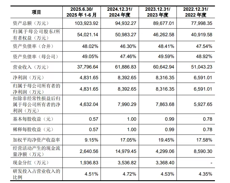 报告期内(2024年至2025年上半年),腾励传动的营业收入分别达到5.1亿元、6.06亿元、6.19亿元和3.78亿元;同期净利润分别为6591.01万元、8316.35万元、8392.65万元和4831.65万元,呈现出稳健的增长态势。