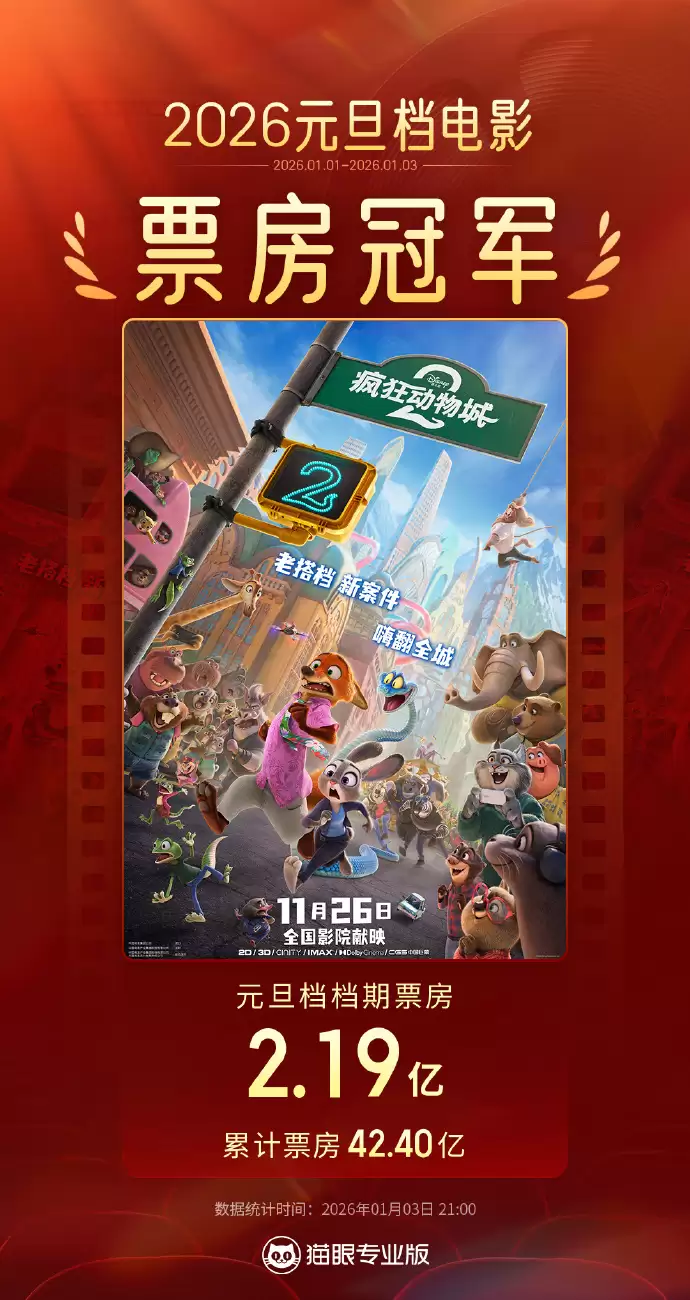 猫眼专业版数据显示,截至1月3日21时,2026年元旦档(1月1日至1月3日)中国电影市场总票房达7.34亿元。迪士尼动画续作《疯狂动物城2》以2.19亿元成绩位居档期票房榜首位,该片累计票房已突破42.40亿元,即将登顶中国影史进口片票房冠军。