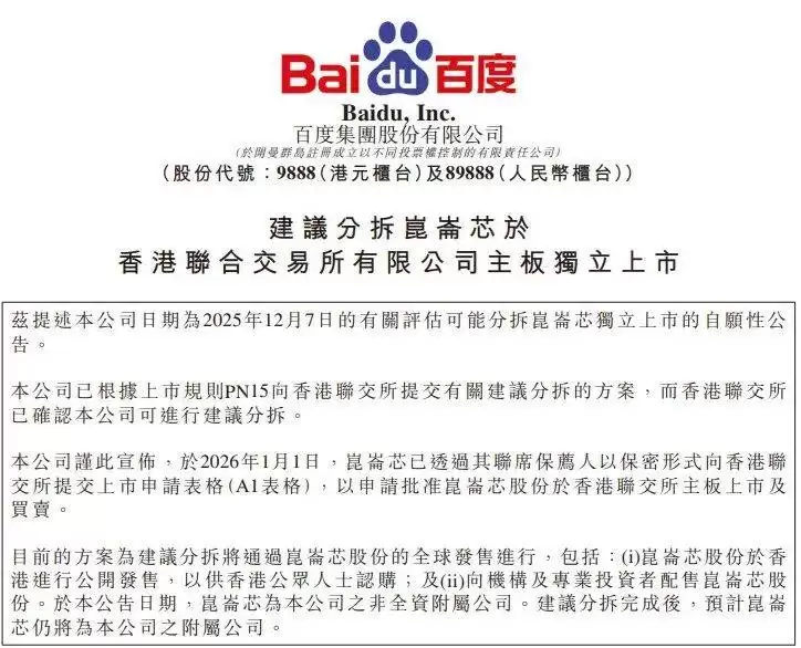 新年伊始,资本市场因为一则分拆上市的消息激起波澜。百度旗下AI芯片业务主体昆仑芯,以保密形式向香港联交所递交上市申请的公告披露后,百度美股股价单日飙升超过15%,创下近期涨幅纪录。这场资本市场的热烈反响,将公众目光引向百度长期布局的硬核技术领域。
