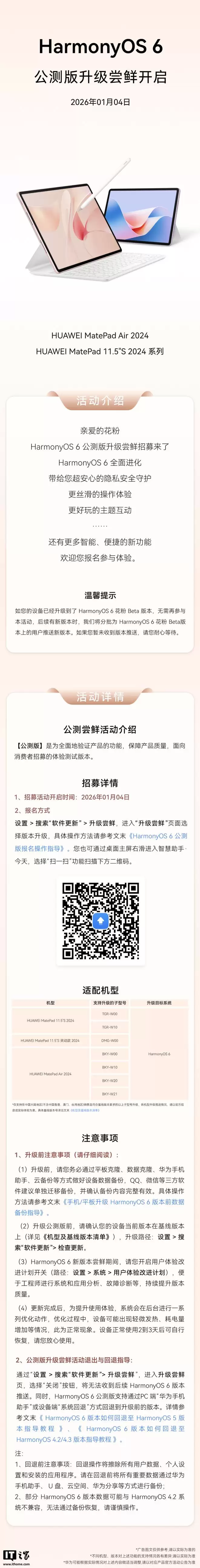 IT之家1月5日快讯,据华为平板软件维护团队官方账号最新动态透露,HUAWEI MatePad Air 2024及MatePad 11.5"S 2024系列平板现已启动HarmonyOS 6公测版升级尝鲜计划。