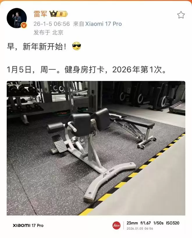 1月5日,雷军在微博晒出了自己2026年的第一次健身打卡记录。近日,他在直播中曾立下新年目标:计划在2026年完成健身打卡一百次。