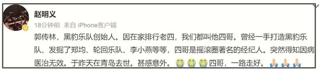 如今众星纷纷发文缅怀,黑豹乐队鼓手赵明义发文缅怀,称郭传林曾经一手打造黑豹乐队、发掘了郑均、轮回乐队、李小燕等等,对于郭传林的离世深表意外。