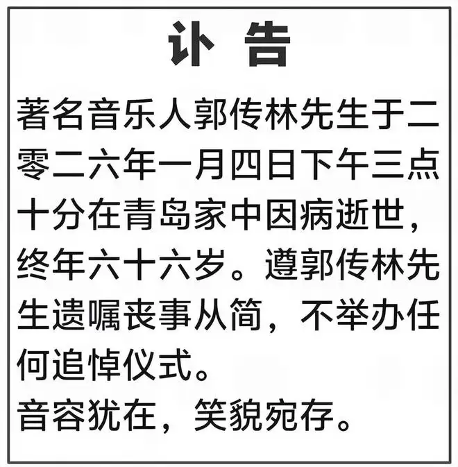 家人也发布了讣告了,公布了更多细节。原来郭传林是在1月4日下午3点10分,于青岛家中病逝。他生前表示丧事一切从简,不举办任何追悼仪式。