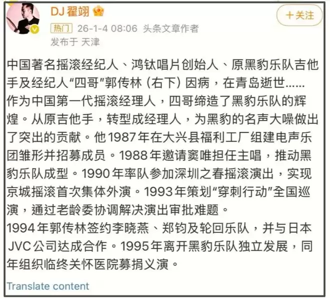 又一个时代结束了。1月4日,业内曝黑豹乐队创始人郭传林病逝了,享年66岁。