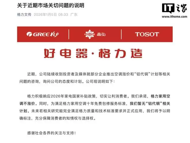 1月5日,IT之家获悉,格力电器今日上午通过其文化传媒中心最新官方公众号“格力文传”发布声明。近期,公司陆续收到来自投资者和媒体的多方咨询,内容涉及部分企业宣布空调产品涨价以及推行“铝代铜”计划等相关问题,询问公司对此的态度和规划。
