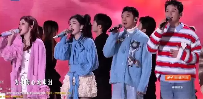 最后再看看蓝台的跨年夜压轴,只有跑男团几人妆造松弛的站在台上表演,唯一一个流量咖,就是新晋流量小生李昀锐。
