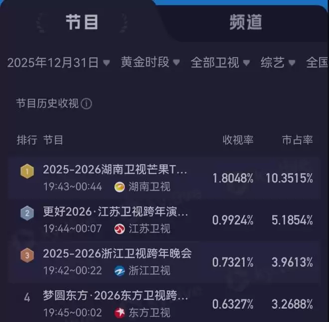 虽然肖战在东方卫视跨年夜上再现了红海奇景,可拿下四大卫视跨年夜收视榜首的还是湖南卫视芒果TV。收视率峰值时段达到1.80%,市场占有率达到10.35%