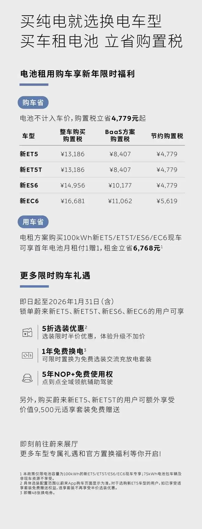 在1月31日前,订购蔚来ET5、ET5T、ES6、EC6这四款车型的用户,还能享受到多项限时权益:选装件半价优惠、一年免费换电服务,以及五年的NOP+免费使用权。此外,选购ET5或ET5T的用户,将额外获得价值9500元的舒享套装。
