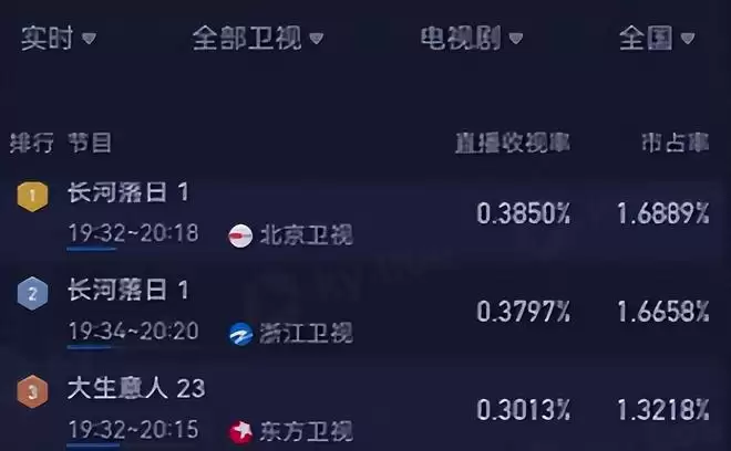 所以这部剧首播收视率还真不错,在北京卫视和浙江卫视首播2集,爱奇艺和腾讯播出4集,卫视收视率前2名分别是北京卫视和浙江卫视,都是因为播放的《长河落日》。