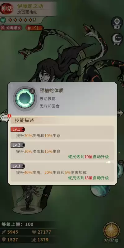 颈棱蛇体作为伊藤蛇之助的基础增益能力,其中基本就是在上场的时候就可以直接触发的。触发这个效果之后,在上面可以提升伊藤蛇之助20%攻击和10%生命数值,最多的时候是将此类增益技能升级到3级。这个时期提升的数值就到了40%攻击、20%生命和5%伤害加成了。而这个增益基本也是在他达到18星级的时候才可以触发到的强度。最后一个技能叫做狩猎本能。根据伊藤蛇之助最后的这个被动效果,在回合开始的时候。 此时场上要是存在蛇毒标记的单位,伊藤蛇之助可以立即对合格目标发动一次恶堕蛇手的技能攻击。而后续这个技能效果会冷却3回合,当然要是当时场上不存在蛇毒标记的敌人,那么此时就会给敌方生命百分比最低的那位目标施加一层蛇毒的效果。这个效果在一战斗开始时,就可以让伊藤蛇之助获得10%攻击提升的增益效果。