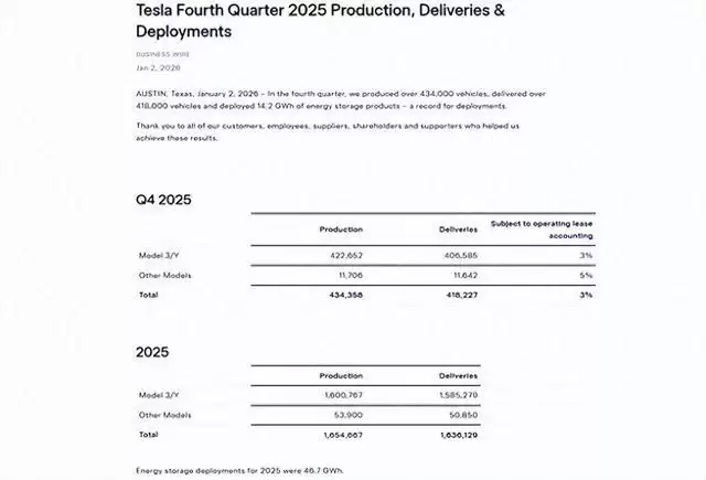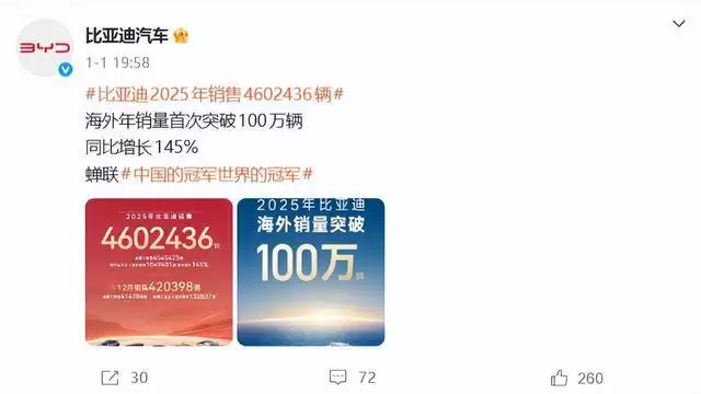 先看一组实打实的数据,就能明白特斯拉的处境有多难。2025年最后三个月,特斯拉交付了418227辆车,全年总共交付1636129辆。这个数字不仅没达到分析师的预期,连特斯拉自己之前预估的都没做到。对比上一年,去年四季度的销量直接降了15.6%,全年也少卖了不少。更直观的是,咱们国产的比亚迪去年全年卖了225.67万辆电动车,比上一年增长了27.86%,稳稳超过了特斯拉,成为全球销冠。