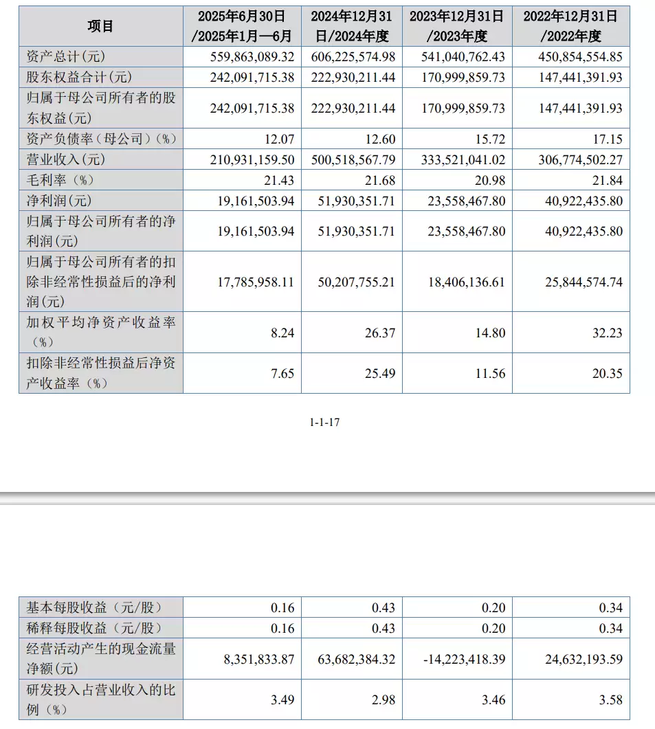 在报告期内(2024年至2025年上半年),天运股份的营业收入分别为3.07亿元、3.34亿元、5.01亿元和2.11亿元;净利润则依次为4092.24万元、2322.85万元、5193.04万元和1916.15万元。