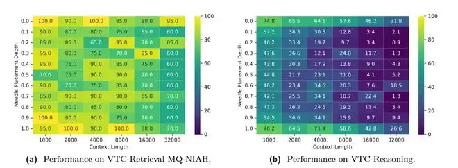图 2:VTCBench针对模型在长图像中检索信息的热力图。横轴代表上下文长度,纵轴代表关键事实(Needle)在文档中的深度。展现了模型表现的“迷失”与“突破”。