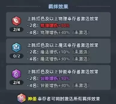 羁绊分为物理、魔法和异能三大类型,而神话+幸存者属于全系幸存者,能够与任意羁绊自由搭配。当上阵同类型幸存者达到2名或4名时,便会激活对应的羁绊增益。