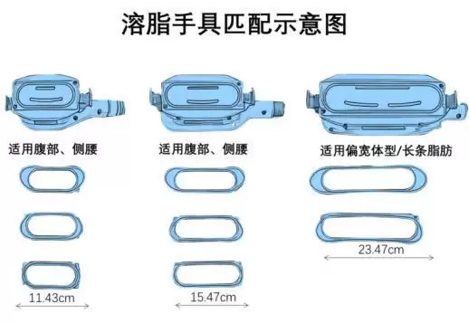 尽管冷冻溶脂不能有立竿见影的效果,但与传统的吸脂手术比较,冷冻溶脂不仅操作全程无创、风险小,还具有渐进式脂肪代谢的优势,这样皮肤就有足够时间回弹收缩,几乎杜绝了传统抽脂“瞬间挖空”导致的松弛、凹凸或色沉。当然,要获得良好的疗效,治疗前专业医生对治疗区域的评估和点位标记设计至关重要,并影响效果。有经验的医生会根据每个人的脂肪分布情况及美学需求,选用适配手具(图4),精准贴合不同曲线 ,实现“点对点”个性雕刻[6]。