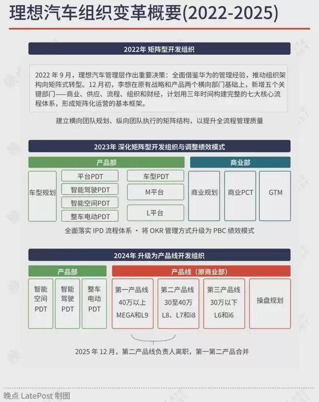 随后的时间里,理想在 2024 年底拿到了历史最好成绩的 58513 月销,但也在 2025 年下半年发布了两款纯电新车 i8 和 i6 之后陷入了增长陷阱,月销徘徊在 3 万到 4 万之间,直到 12 月因为产品线负责人离职再一次调整产品开发组织。总的来看,理想在经过了初期产品成功后,快速向矩阵型开发组织转变,经过三年的磨合,从 IPD 流程驱动,渐渐明确为大产品线模式驱动。