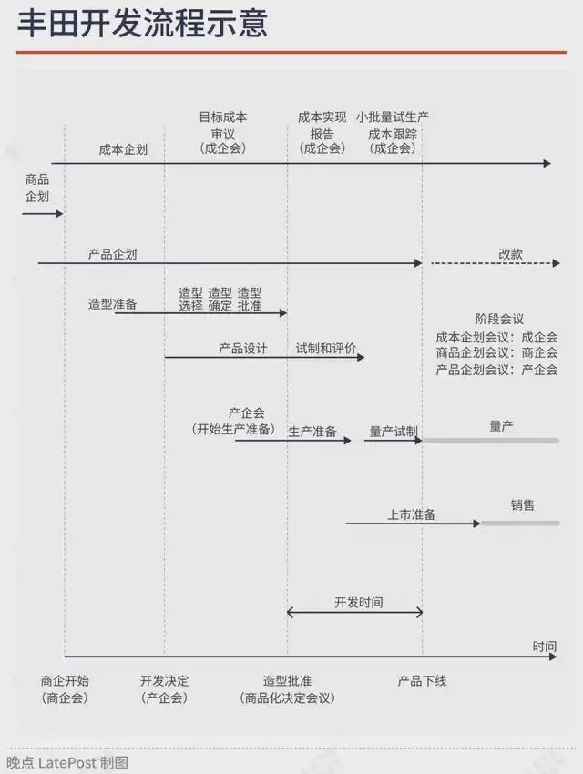 从流程的角度看,丰田的 CE 开发模式由三条主线驱动:商品企划、产品企划和成本企划,涉及三个决策会议:商企会、产企会和成企会。由商品企划开始,在确认商品立项之后,产品企划正式启动,同步的成本企划介入,通过目标成本审议、成本实现报告和小批量生产成本跟踪来逐步收敛对成本的控制。另一边产品企划要落实产品概念,推动造型设计、产品设计、试制和评价、生产准备和上市准备。