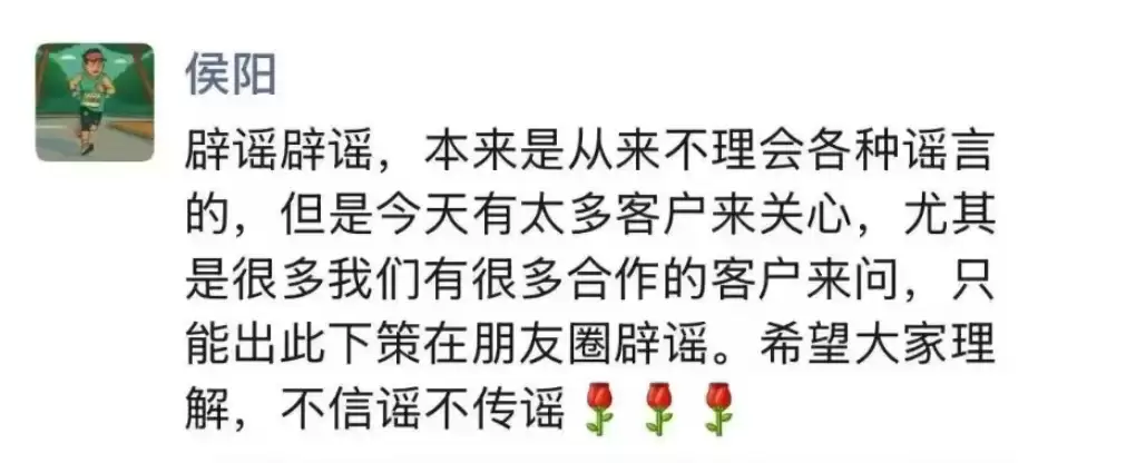 侯阳称,“我通常不理会各种传言,无奈今天实在有太多朋友和客户来关心这件事,尤其是一些重要的合作伙伴也来询问,只好在社交平台上做个正式澄清。”他同时呼吁大家保持清醒,不要轻信和传播谣言。