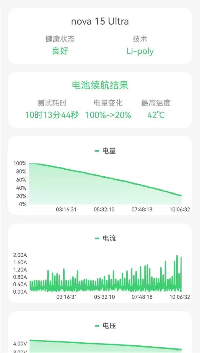 这次的nova 15 Ultra在100~20%的续航测试中坚持了10小时13分钟,折算时间应该在12小时左右,一天中度使用足以。